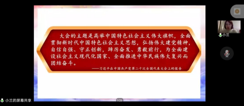 兰图老师的授课内涵丰富,以开阔的视野精准深入的阐释党的二十大精神,使全体师生党员深受教育,备受感动,对全面建设社会主义现代化国家和实现第二个百年奋斗目标的重大部署有了更为深刻的理解和把握。我们生逢盛世,在新时代的征程上我们要时刻牢记作为一名共产党员的义务和权利,始终严格要求自己,我们要切实把思想和行动统一到党的二十大精神上来,忠诚履职、开拓进取,在新时代新征程上展现新气象新作为,为全面建设社会主义现代化强国、实现中华民族伟大复兴的中国梦作出更大贡献。