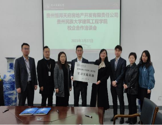 何璘书记与范紫微总经理代表校企双方共同签署了合作协议,并进行学院实习实践基地的授牌。会后,贵州恒邦天府房地产开发有限责任公司对前来应聘的同学一一进行现场面试。