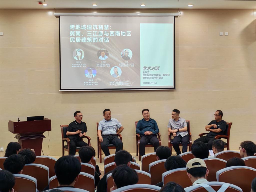 讲座尾声,华南理工大学二级教授唐孝祥、河北工程大学任洪国教授、陕西理工大学闫杰教授、重庆科技大学杨恩德教授、贵州理工学院王东教授与在场的同学们围绕跨地域建筑智慧——冀南、三江源与西南地区民居建筑进行学术对话,探讨建筑空间面对不同的地域、不同的民族、不同的文化有怎样对应的呈现形式等。