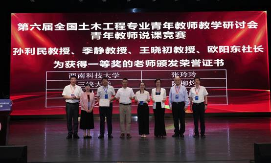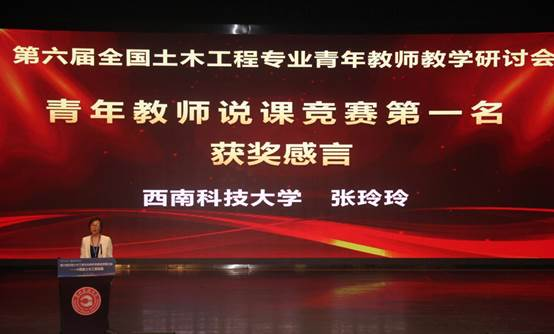 说课竞赛的决赛由教育部土木工程专业教学指导分委员会组织实施,分委员会专家和学生代表组成评审团,从教学内容、方法创新、技术融合等维度打分,华南理工大学季静教授、武汉理工大学谷倩教授进行现场点评。最终,西南科技大学张玲玲老师脱颖而出,斩获第一名。