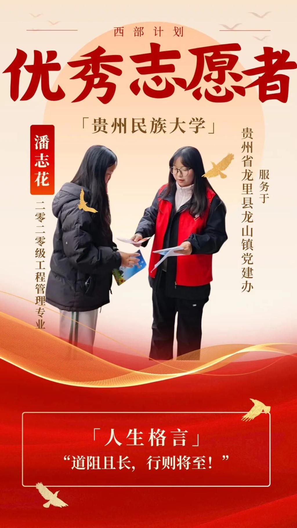 潘志花,BETWA西汉姆联2020级工程管理专业毕业生,现服务于贵州省龙里县龙山镇党建办。潘志花同志在执行西部计划服务期间全身心投入党建办驻村干部管理、退休干部管理、团委、关工委工作。她在工作中主动作为,尽职尽责,先后获得龙山镇2024、2025年度“优秀职工”、2025年度“龙里县优秀共青团干部”等荣誉。 此外,潘志花同志积极参与防溺水、未成年人保护、法治宣传等志愿服务活动,累计40余次;撰写活动简报及信息30余篇:其中,镇级公众号采用18篇,县级平台采用6篇。 道阻且长,行则将至。作为一名中共党员,她以实际行动深刻诠释了新时代青年的责任与担当,用坚守践行“全心全意为人民服务”的根本宗旨,赢得了领导、同事与群众的赞誉和认可。