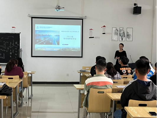 何璘书记在宣讲会开场感谢用人单位给学院学生提供的优质平台,向用人单位详细介绍了学院师资和专业办学等情况,并表示我院与中国水利水电第十四工程局有限公司的校企合作,有助于建工学子高质量就业,有利于企业吸纳优秀毕业生,增进双方的互利共赢。招聘会上,中国水利水电第十四工程局有限公司负责人通过播放宣传视频向毕业生们展示企业风采,再通过PPT从企业发展历程、人才培养体系、签约流程等方面进行宣讲。