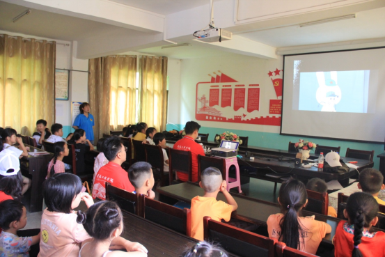 今天的计划是进行一次爱国主题教育。早上九点,实践队抵达了刘庄村,首先开展的第一项活动是组织观看爱国教育片。针对宣讲对象的年龄层次,志愿者们特意挑选了符合他们兴趣的动画作品《那年那兔那些事儿》,“那兔”的主角都是萌萌的动物,以诙谐幽默的方式讲述了我国近现代历史事件和军事科技发展的艰辛历程,是一部非常有趣的爱国主义科普作品。“那兔”的故事以兔子为主线,从清末时期兔子的家——种花家(中华家)的兴衰讲起,讲述了兔子是如何通过努力,打败脚盆鸡,赶走秃子(国民党),经历了和鹰酱的残酷一战,又造出了自己的蘑菇蛋(核武器)和航空母舰,逐步成为一个富强繁盛国家的故事……动画中,涉及了中国历史上若干个海内外历史事件,如辛亥革命、抗美援朝、两弹一星、苏联解体、两伊战争等。观看完影片后,志愿者向小朋友们讲解了片中所讲述的历史事件,便于他们更好地理解片中所表达的内涵。通过观看“那兔”这部影片,让小观众们了解了这些为建设中国奋不顾身的先辈们,让他们意识到,没有这些可爱的先辈,就没有如今富足安逸的生活。这对孩子们来说是一次心灵的洗礼,更是一次深刻的革命教育,让他们进一步接受爱国熏陶,使孩子们从小建立国家的认同感和自豪感。