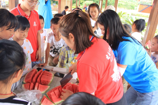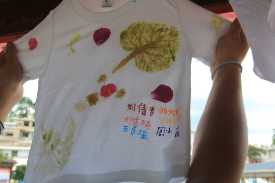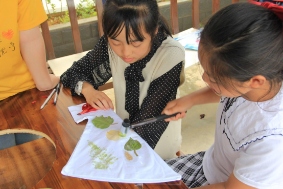 七月的骄阳下,虽身处爽爽的贵阳,中午的烈日依旧让人感到酷热难耐,志愿者们买来西瓜与大家一起分享,欢声笑语中,大家的心更近了、情更浓了。短暂的休息之后,志愿者们带领着小朋友开始了今天的拓染工艺体验活动。大家有序地分为几个小组,照着大哥哥大姐姐的样子,开始了他们创造的过程。拓染的染料都是来自自然界中的植物,大家就地取材,都找到了自己心仪的自然之色,于是,大家都开始将那属于自己的早已浮现的“时尚”实现在或布或衣服中。制作的过程中,有困难就解决困难,没有工具,就自己“造”,地上的石头、山上的树叶,都成了小工匠们手中的武器。小朋友们将自己多年在村庄中积累的动手能力展现在志愿者们眼前,肆意地发挥着他们天马行空的创意。随着一件一件艺术品被挂上展览台,在蓝天下随着微风轻轻飘动,再配上孩子们灿烂的笑脸……这一幅动人的景象真是让人心旷神怡。